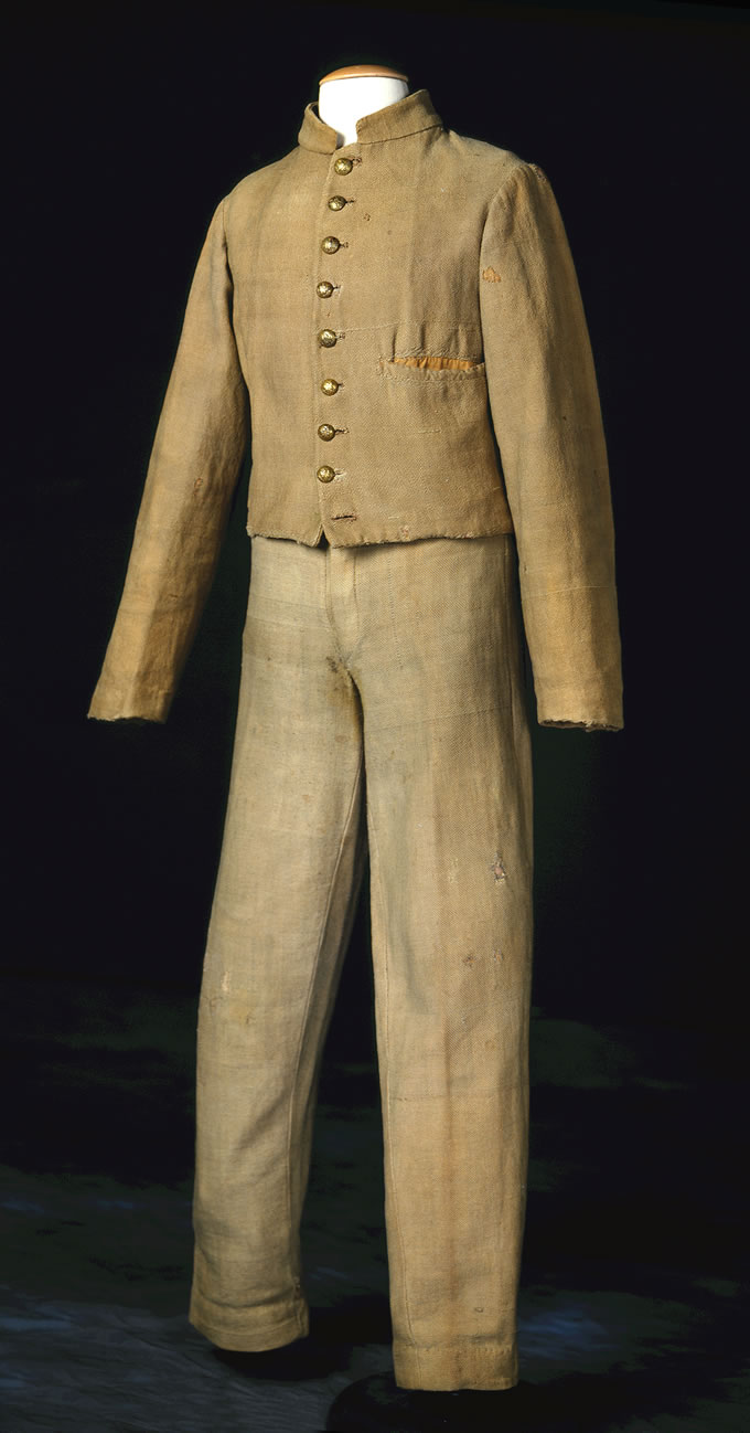 This uniform, both jacket and trousers, is of white wool/jean and probably similar to what was issued to the Missouri Brigade in Arkansas on May 1-2, 1861 just prior to the Battle of Elk Horn Tavern ( Pea Ridge ). The uniform pictured to the right is of a butternut or brown color and this is due to years of wear and exposure to light inside museum display. This uniform is described by Pvt. Ephraim Anderson in the “First and Second Missouri Brigade” as follows: