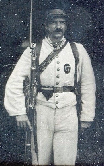 The mid-war Confederate Missouri Brigade / Army of the West impression is that of the Western Thearter Confederate Infantryman. The men of the early war Missouri State Guard are organized into the First Missouri Confederate Brigade in Osceola, MO December 1861. In April 1862 following the March 7-8 battle of Elk Horn Tavern ( Pea Ridge, AK ) the Brigade is transferred east of the Mississippi River. In Sept. of 1862 the Brigade is reorganized and Gen. Cockrell takes command after the death of Gen. Little during the battle of Iuka. The men of Cockrell's Missouri Brigade go on to fight in the battles of Corinth, Port Gibson, Champions Hill, Big Black, and finally the Seige of Vicksburg in May 16-July 3, 1863. There are 2 seperate uniform options and impressions for this Mid-war Confederate Missouri Brigade/Army of the West 1862-1863 Impression. The first is that of the uniforms issued to the Missouri Brigade in Arkansas on March 1-2, 1862 just prior to the battle of Elk Horn Tavern. This uniform impression is that of the undied white sheeps wool, or ice cream suit. Here is what Pvt. Ephraim Anderson writes about these uniforms "Our regiment was uniformed here; the cloth was of rough coarse texture, and the cutting and style would have produced a sensation in the fashionable circles: the stuff was white, never having been colored, with a goodly supply of grease - the wool had not been purified by any application of water since it had been taken from the back of the sheep" The second impression is that of uniforms issued to the Missouri Brigade in Mississippi late 1862, what is know as the Columbus Depot jacket with grey jean wool and blue cuff and collar. The Missouri Brigade would be in this Columbus Depot uniform up to the siege and finally the surrender at Vicksburg, MS 1863.